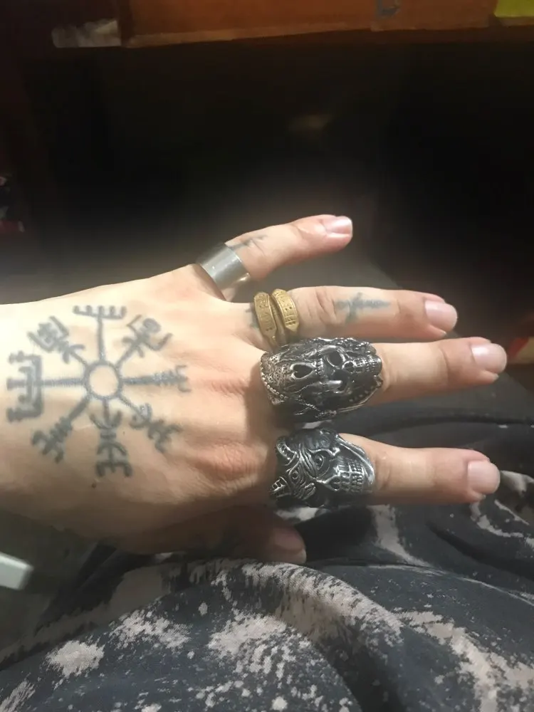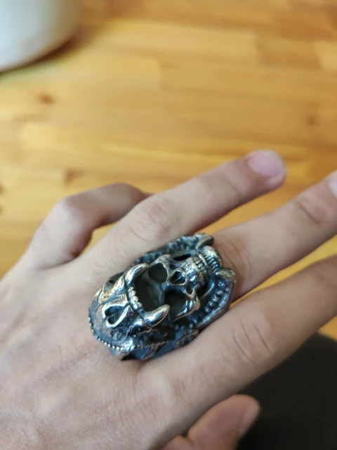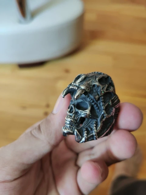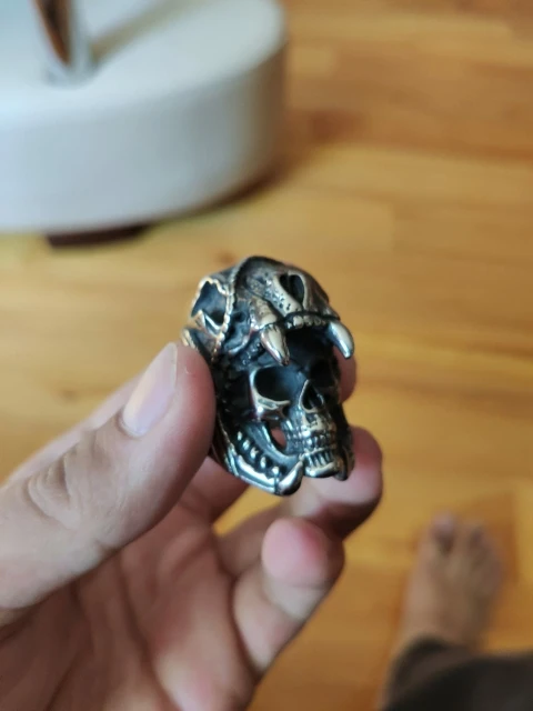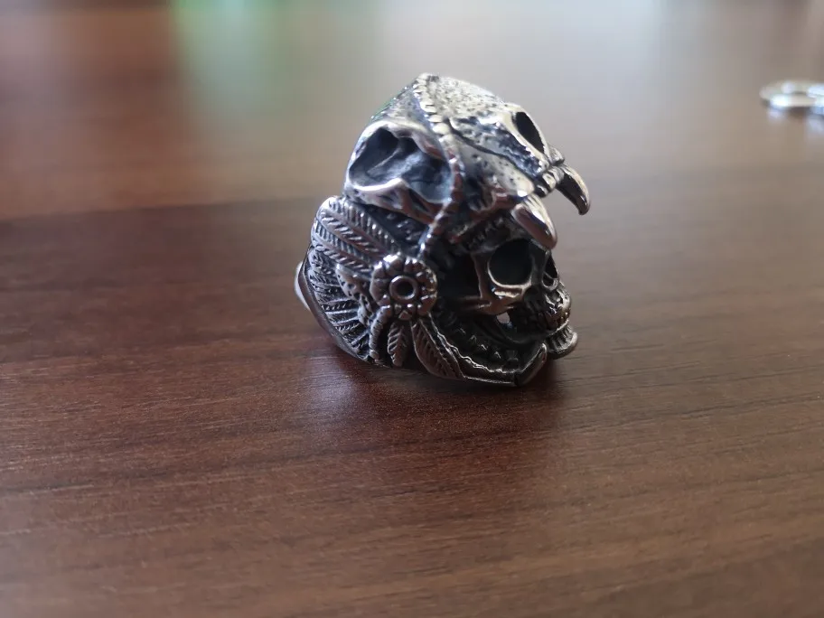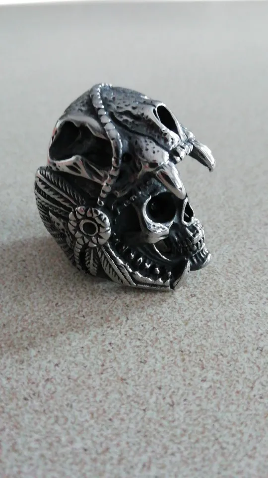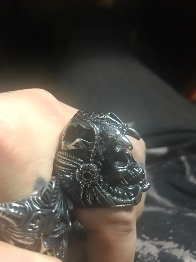 Put this ring on and feel the bold spirit coursing through your veins. It features a fierce skull covered by a jaguar head pelt, together with bewitching headdress - all skillfully carved into stainless steel.